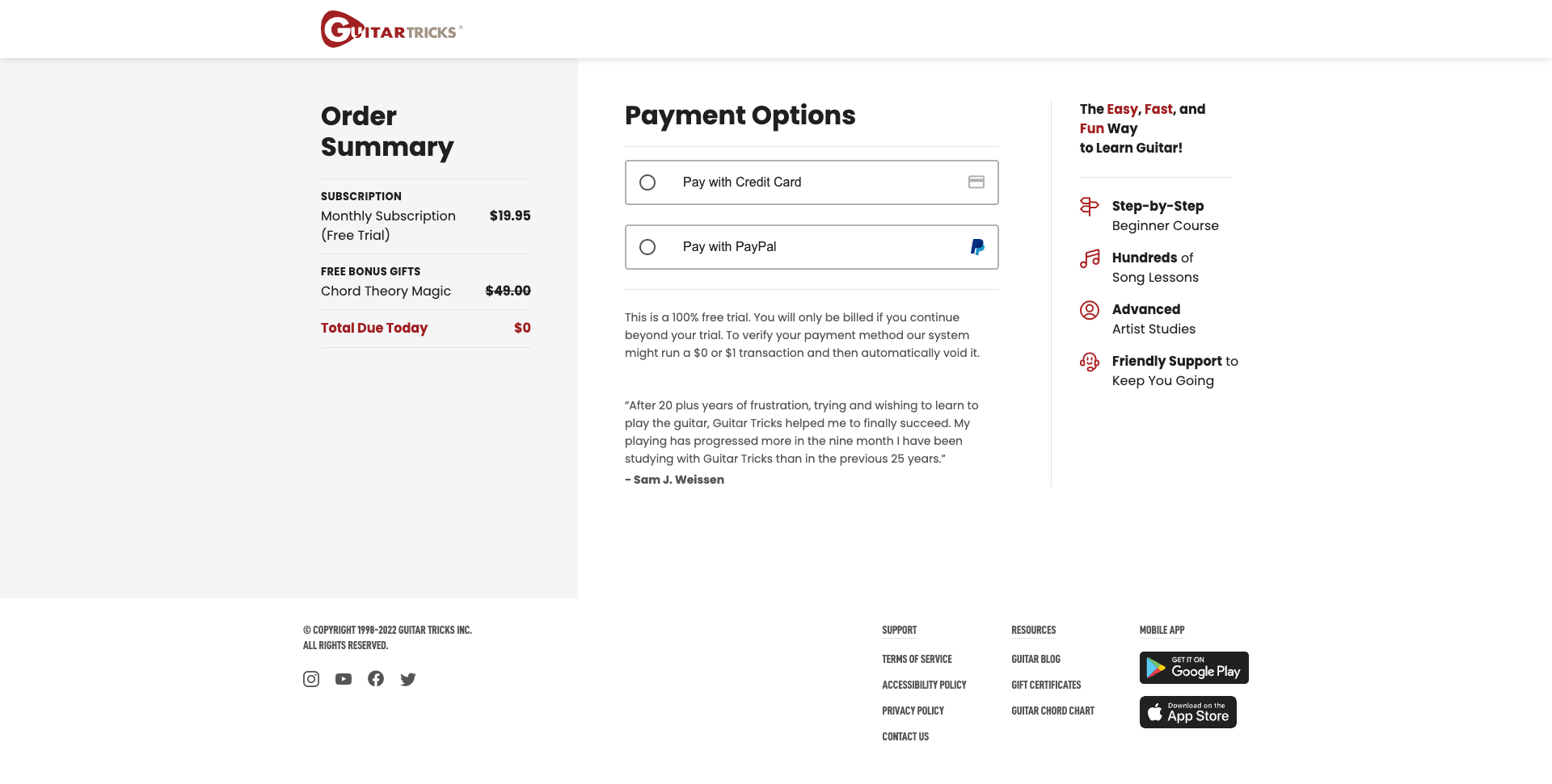 However, requesting payment details is still something that customers generally dislike; Guitar Tricks, in this regard, offers a full refund of the subscription cost, no questions asked, within the first 60 days after the payment date.